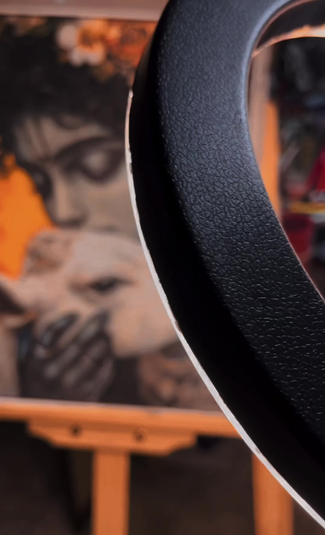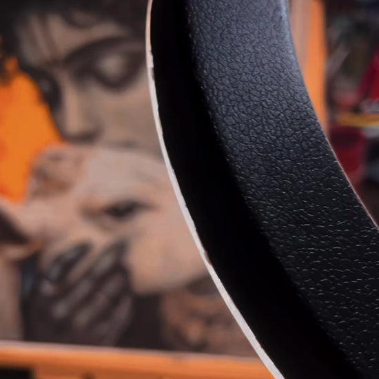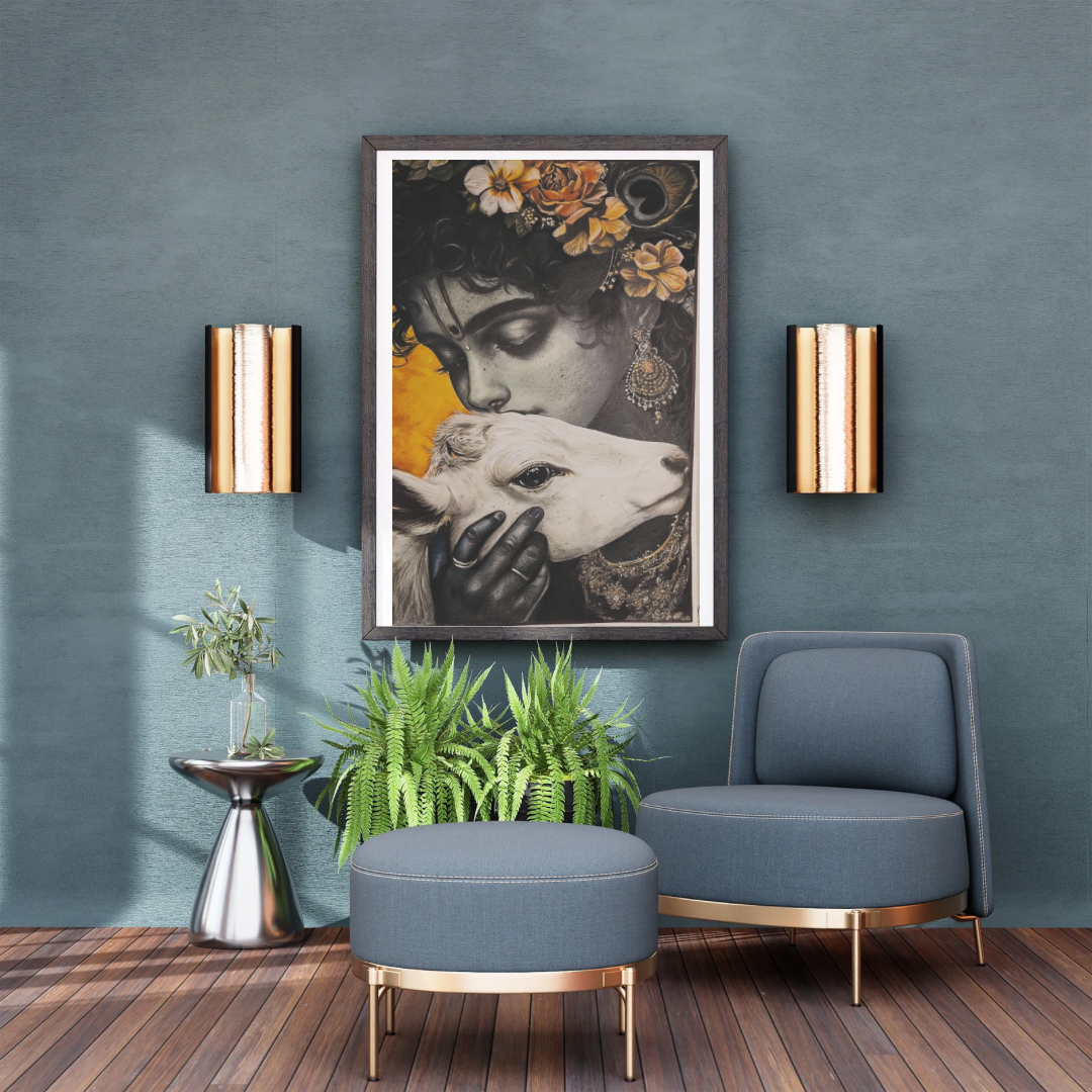 A soulful hand-painted depiction of Krishna with a cow, symbolizing peace, divinity, and love. Rich golden and earthy tones make it a perfect centerpiece for cultural and spiritual spaces. Hand painted on paper.