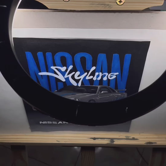 A bold hand-painted artwork of the legendary Nissan GTR 34 Skyline. Perfect for car enthusiasts and collectors, this piece adds power and speed to any room.